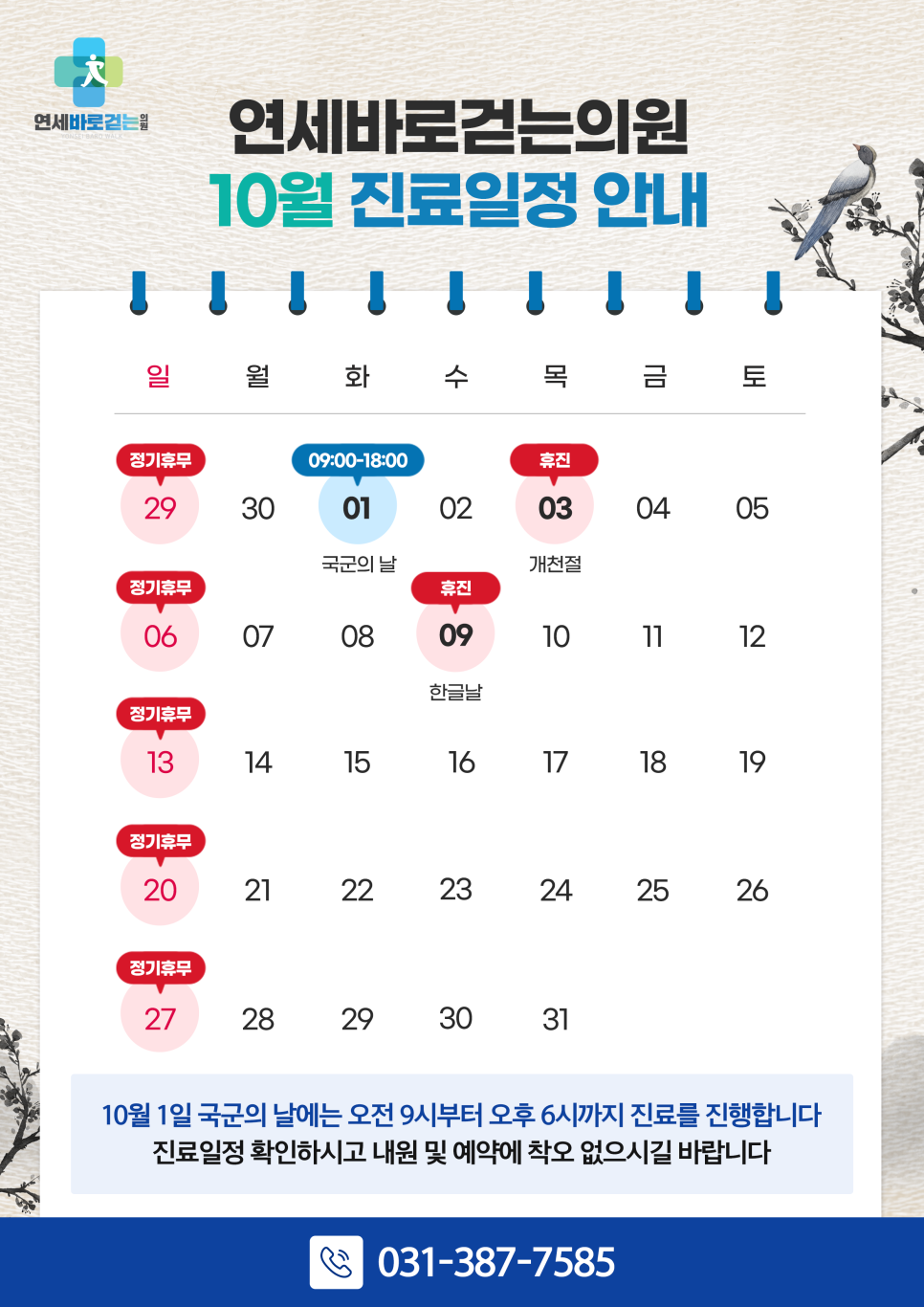 연세바로걷는의원 10월 진료일정 안내 10월이 다가오면서 연세바로걷는의원의 새로운 진료일정이 발표되었습니다. 환자 여러분들께 더 나은 서비스를 제공하기 위해 더 많은 의료진이