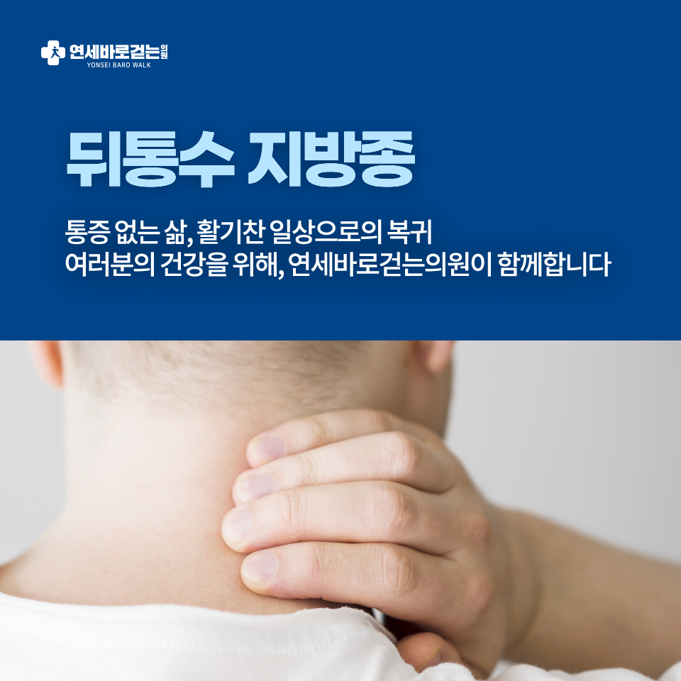 뒤통수 지방종, 걱정되신다면? 연세바로걷는의원이 알려주는 정확한 진단과 치료법 뒤통수 지방종은 뒤통수 부위에 지방이 축적되어 형성되는 양상을 가리키는 용어입니다. 이는 어떠한